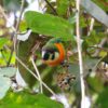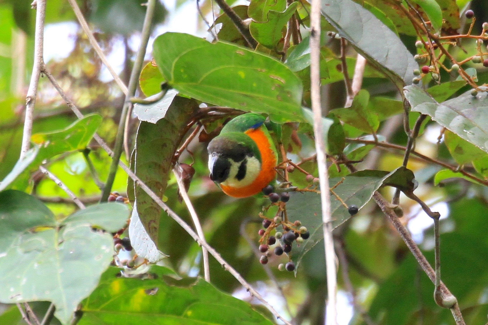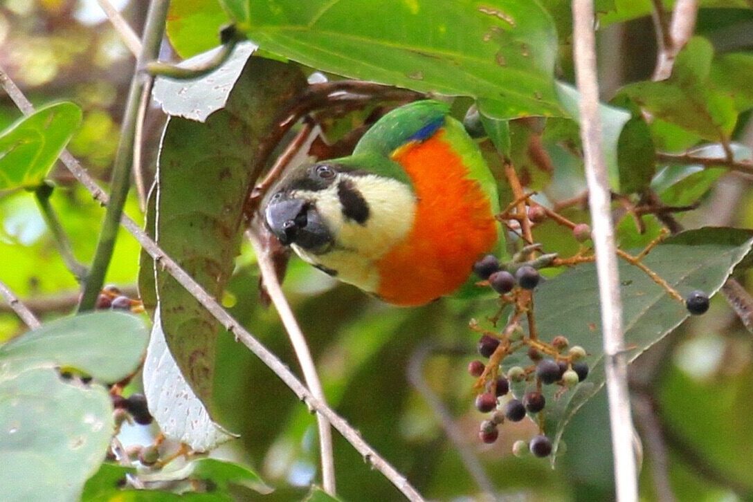 Dried soaked figs (soak in water a few hours), two or more per bird per day; once daily, a drop of Konakion (Roche) or other vitamin K additive; fruit such as: apple, pear, orange, banana, pomegranate, forming at least 50 percent of diet; soaked sultanas; berries such as: elder, mountain ash, pyracantha; spray millet; small seed mixture such as: canary, oats safflower, limited sunflower; cooked beans and pulses; rearing food: hard-boiled egg, wholegrain bread and carrot, all ground to crumbly consistency. Complete pellet, if taken. Breeding diet: some pairs consume mealworms mainly for first 3 weeks of chicks’ lives, also well-cleaned maggots or proprietary insectivorous food. Withhold seed for first 3 weeks of chicks’ lives.