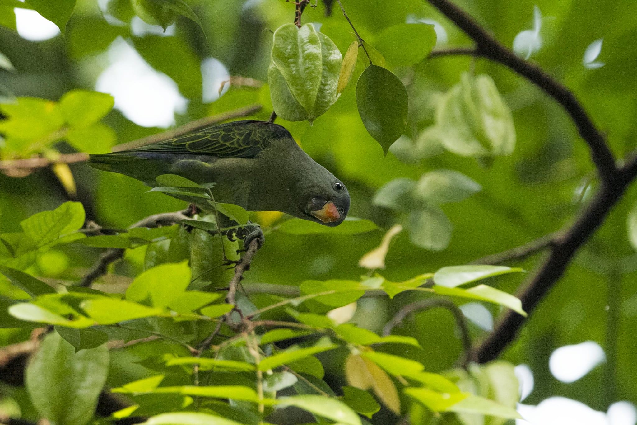 Not globally threatened. In the majority of the species’ range, the widespread conversion of habitat into plantations is thought to be causing a decline. Although it feeds in these plantations and is tolerant of degradation, it is thought to require nearby forest for breeding. From 2012 to 2022, forest cover in its range reduced by 17-22% and this is thought to have caused concomitant declines of 15-25%. May be impacted by trapping for the pet trade.