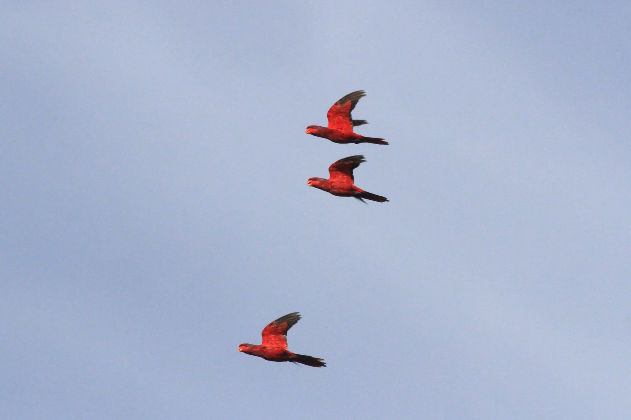 Habits are similar to those of other Eos species. Usually seen in flying flocks of ten or more birds; flocks are often noisy. When seen singly or in pairs are more shy.