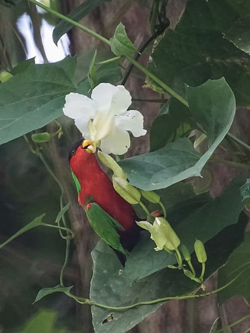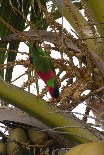 Diet includes a variety of flowers including coconut palm and drala Erythrina indica and Spathodea campanulata; also fruit including mango Mangifera indica and soursop Annona muricata.