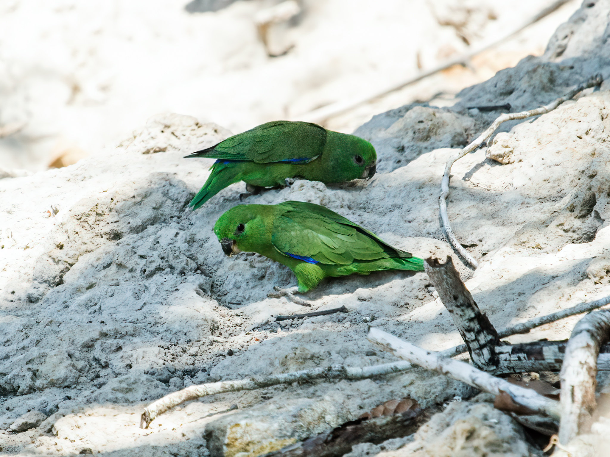 The Dusky-billed Parrotlet takes mineral soil from clay river banks alongside other parrots. This is called geophagy.