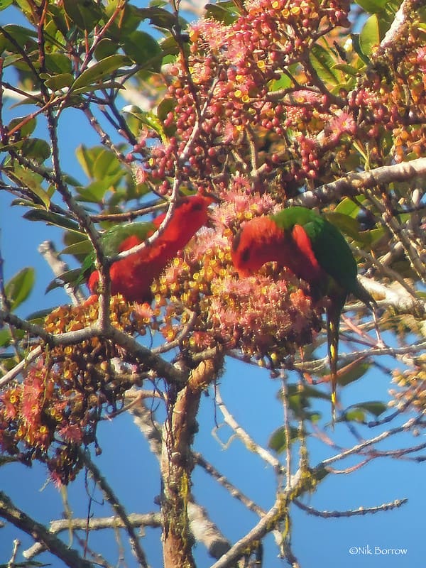 Found in pairs, or flocks of 15 or more individuals. Groups with other Charmosyna lorikeets in the tops of flowering trees.