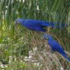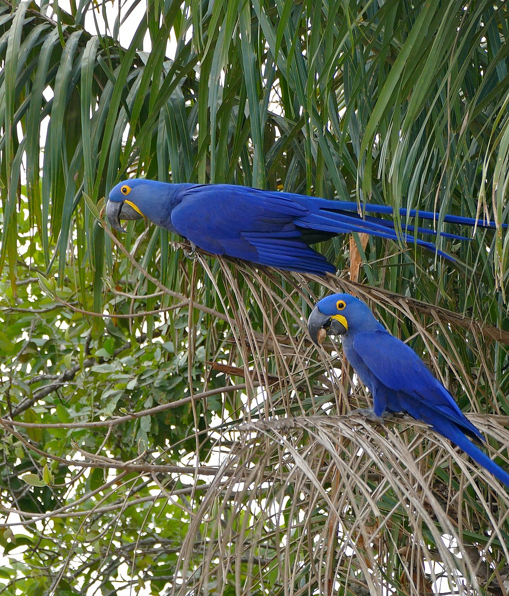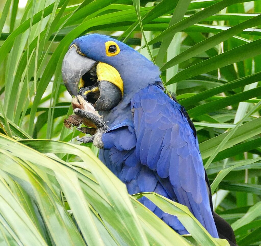 The Hyacinth Macaw forages for palm nuts found in cattle dung. The nuts are consumed by the cattle and pass through undigested.