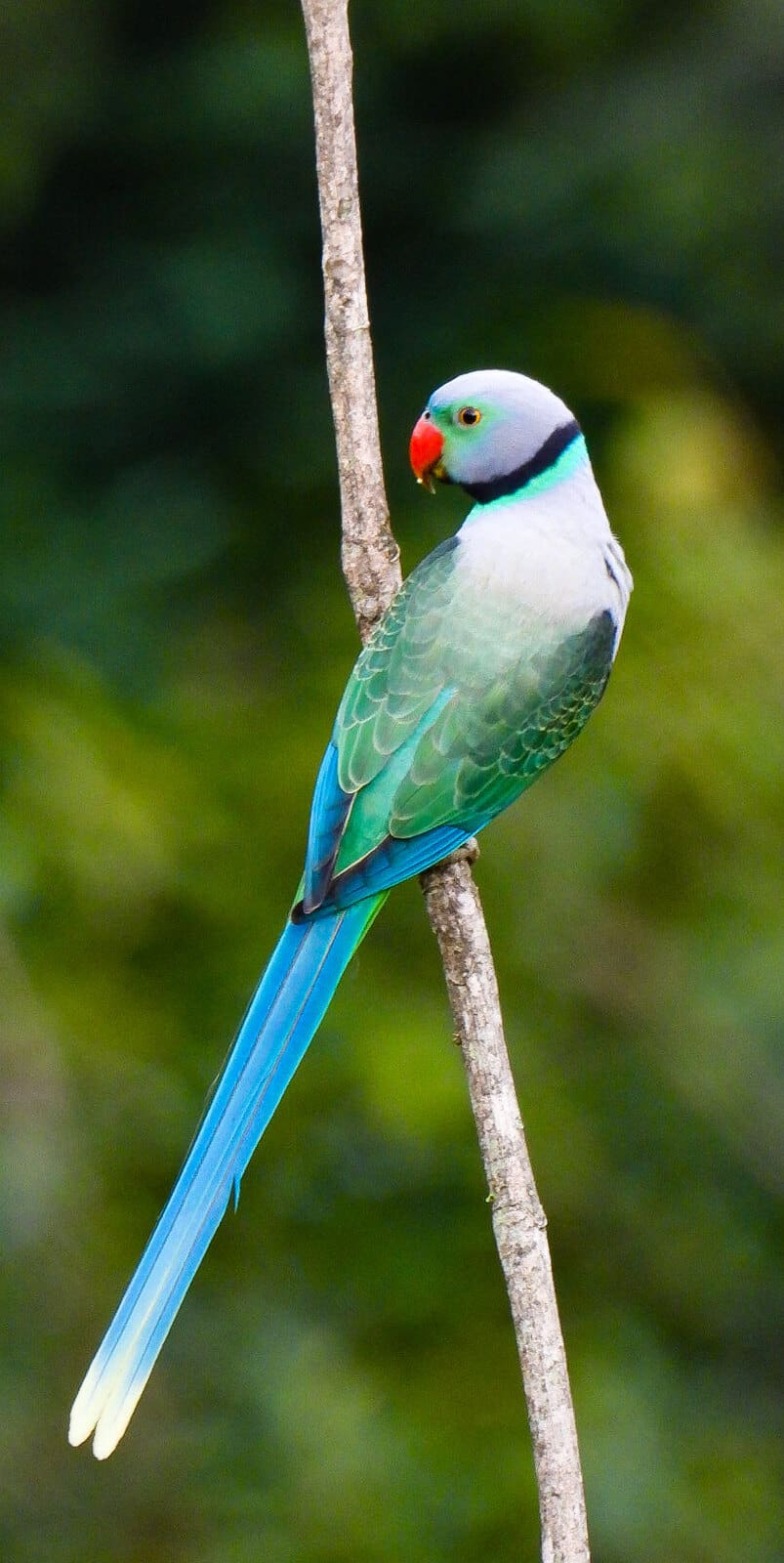 Male-Grey head and upperparts; green and cheeks; area around eyes green; blue tinge on forecrown; black chin and stripe on lower cheeks; black collar encircling hindneck, bordered below by green/blue band; green/blue lower back to upper tail coverts; green upper wing coverts scalloped with yellow/green; yellow/green underparts washed with pale blue; blue central tail feathers tipped with yellow, the side tail feathers green tipped with yellow; red upper mandible tipped with yellow, brown lower mandible. Eye yellow. Female-Green/blue band around hindneck absent; green on face and forecrown minimal; pale green mantle, breast and abdomen, often suffused with grey. Beak black.