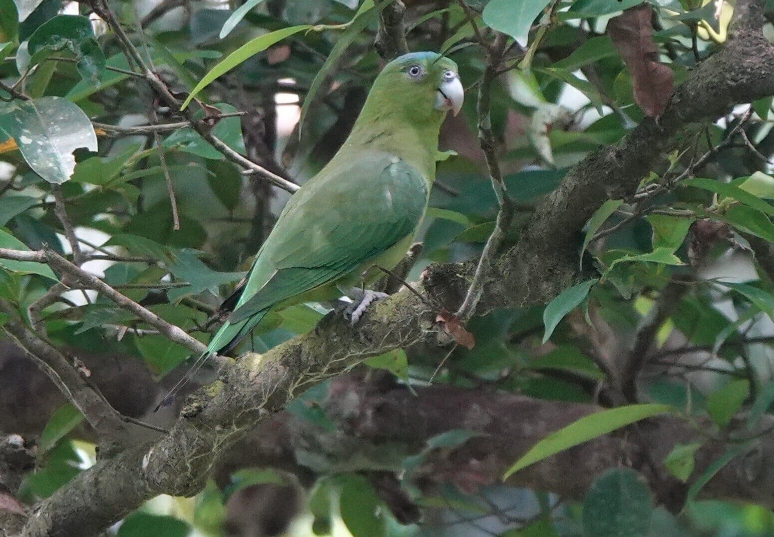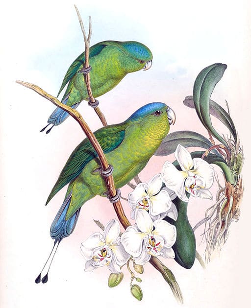Both adults – Mainly green; head bright green with powder-blue suffusion on crown (but green on forehead). Undertail blue. Eye brown. Beak white/grey. Female has shorter spatules (racquets).