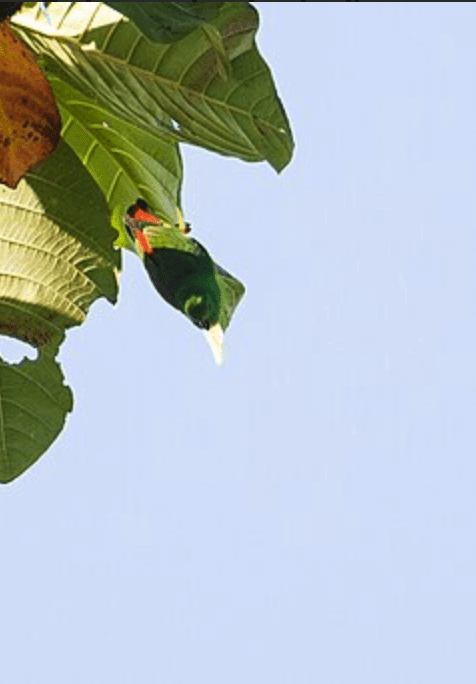 Seen singly, in pairs or in small groups. Keeps to the upper stages of the forest canopy. Noisy and conspicuous in flight. Feeds quietly amongst foliage.