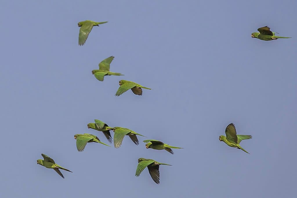 As in Green Conure (A. holochlora): resident, but will wander locally in response to seasonal changes in food availability. Often seen in flight in flocks up to 200 individuals, typically flying higher and with slower wingbeats than similar smaller parakeets. In Nicaragua, flock sizes tend to be larger in the wet season.