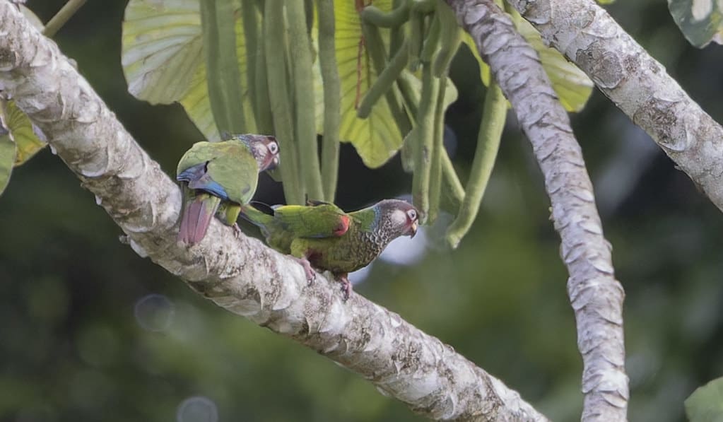 Found in flocks of 10 or 15 birds. During breeding season seen in pairs and families. Feeds and rests in foliage of upper stages of canopy, where it is well camouflaged. Noisy in flight.