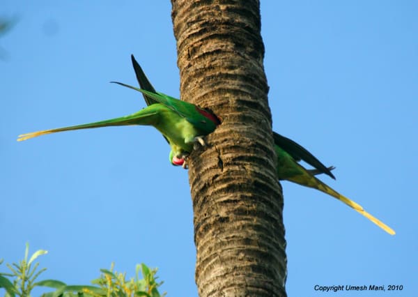 Forages in mixed flocks with Slaty-headed and Malabar parakeets. Often breeds in colonies. Male territorial.