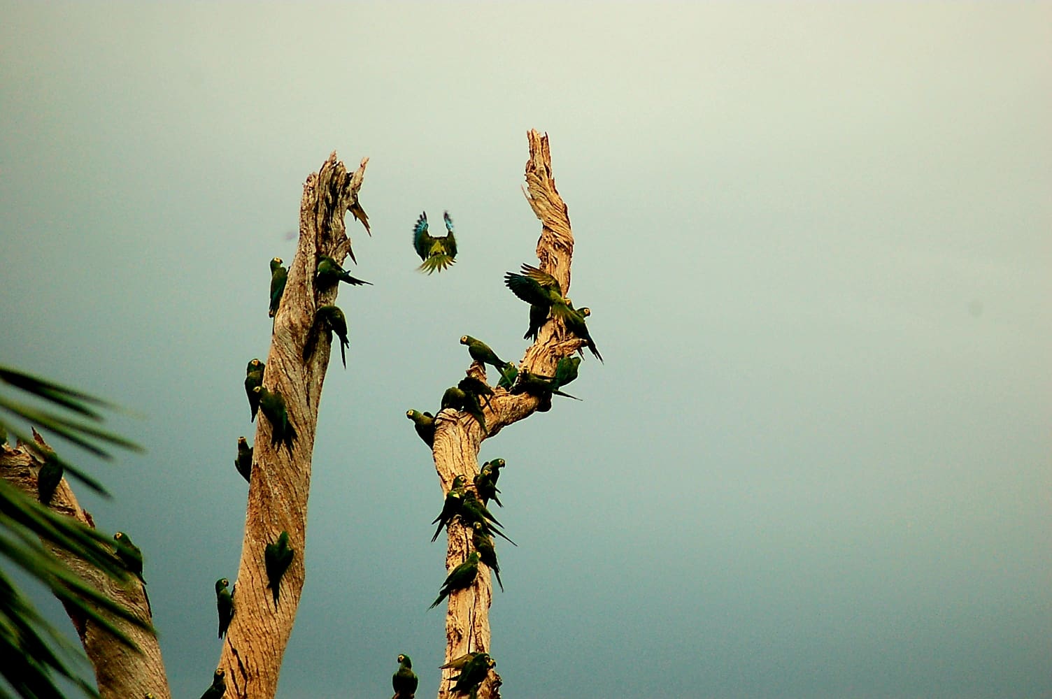 Gregarious birds with flocks of up to 100 reported, roosts in Moriche palms (Mauritia flexuosa), occasionally nomadic into cultivated areas.