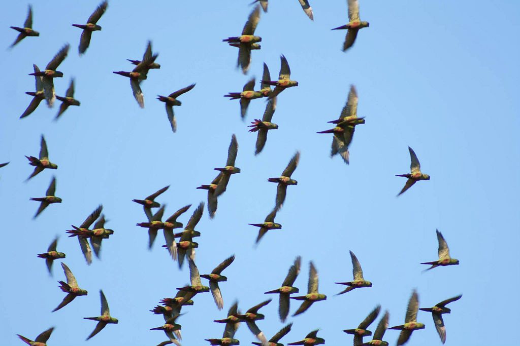 Gregarious, even in breeding season. Seen in flocks from a few individuals to several hundred. Roosts communally.