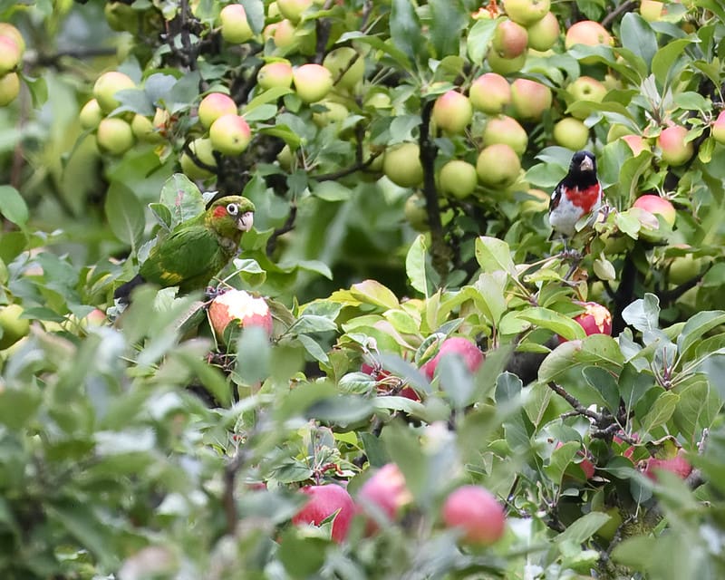 Fruits such as: apple, pear, banana, cactus fruits, orange, pomegranate, papaya, mango; vegetables such as: carrot, celery, green beans and peas in the pod; green leaves such as: Swiss chard, kale, dandelion, lettuce, chickweed; berries such as: mountain ash, pyracantha, elder; seed mix such as: canary, millet, safflower, oats, buckwheat and a little hemp; some sunflower sprouted or dry; complete kibble.