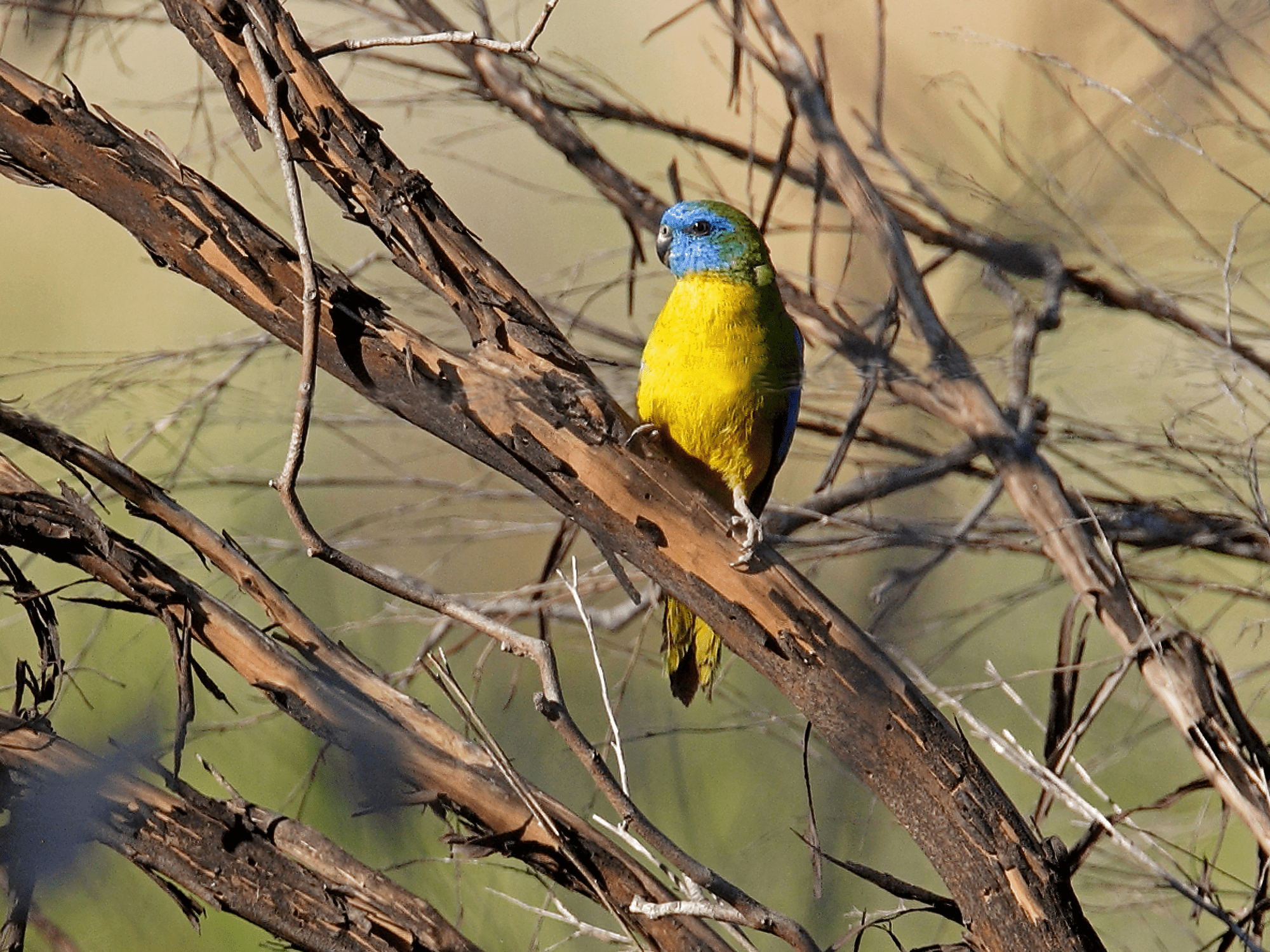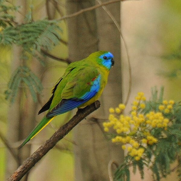 Male-deep blue face; bright green upperparts; bright yellow underparts and underside of tail, tinged with orange on upper breast; variable orange patch on centre of abdomen; blue underwing coverts with brown/red on innermost median wing coverts, forming “patch”; bright green uppertail. Beak grey/black. Eye brown/grey. Female-paler blue face; buff/white lores; pale green breast; yellow underparts and undertail, more often suffused with orange on centre of abdomen than male; shoulder markings absent; upper wing coverts paler blue; pale underwing stripe.