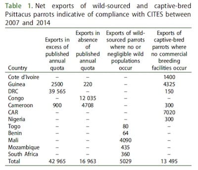A rise in exports from Mali was also discussed at the meeting. The species does not occur in Mali suggesting the birds are smuggled in from other countries before being issued with paperwork to enter international trade. This same ‘loophole’ was exploited previously to facilitate exports of wild Grey Parrots prior to the transfer of the species to Appendix I of CITES – over 5,000 wild Grey Parrots were exported from non-range states between 2007 and 2014 (Martin 2018a, see table below).