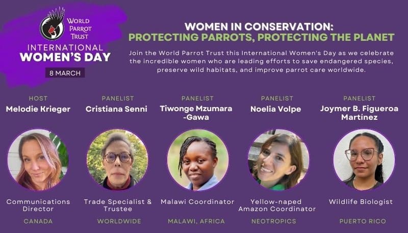On Saturday, 8th March 2025, the World Parrot Trust celebrated International Women’s Day by shining a light on some of the remarkable women working to protect parrots and their habitats. Across the globe, conservationists, researchers, and advocates dedicate themselves to ensuring the future of endangered species, and WPT is proud to collaborate with so many of them.